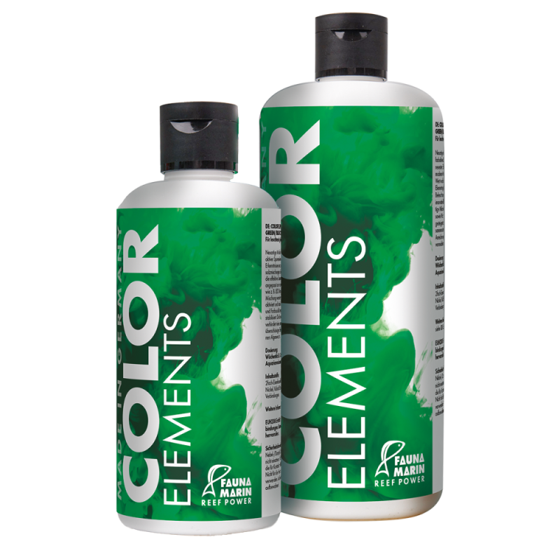 Neue Spurenelement-Mischung basierend auf organischen und anorganischen Mineralien und Elementen. Grün blau Komplex zur Ausarbeitung der grünen, gelben und türkiesen Farbtöne bei Korallen.