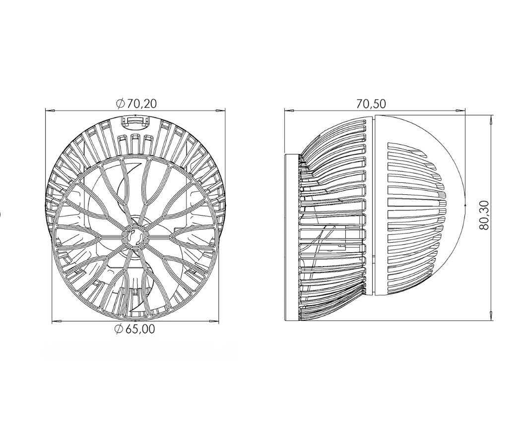 Maße: ø 70 mm; Gesamthöhe 80mm, Gesamttiefe 70 mm