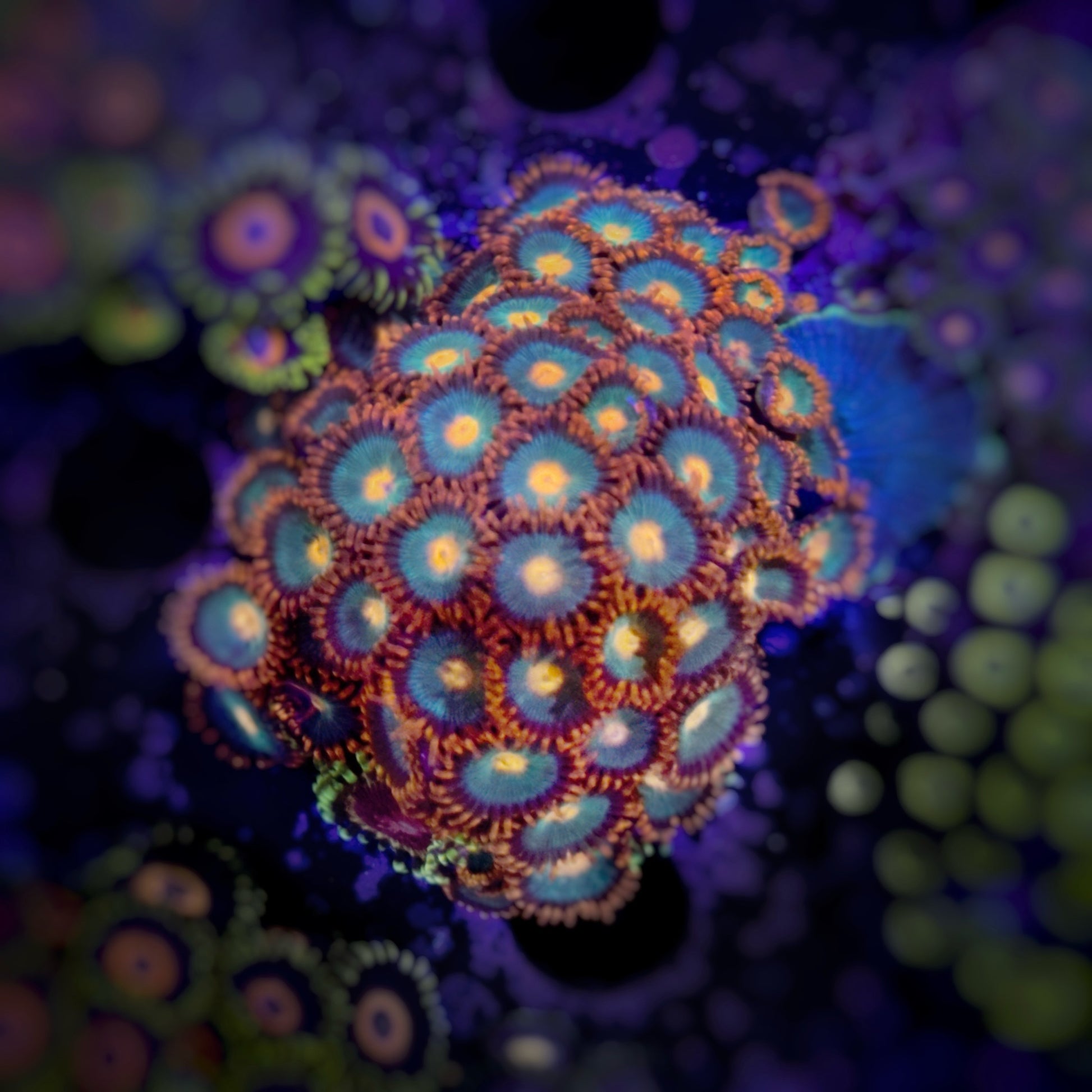 Eine Krustenanemone mit kleinen Polypen in drei kräftigen Farben.