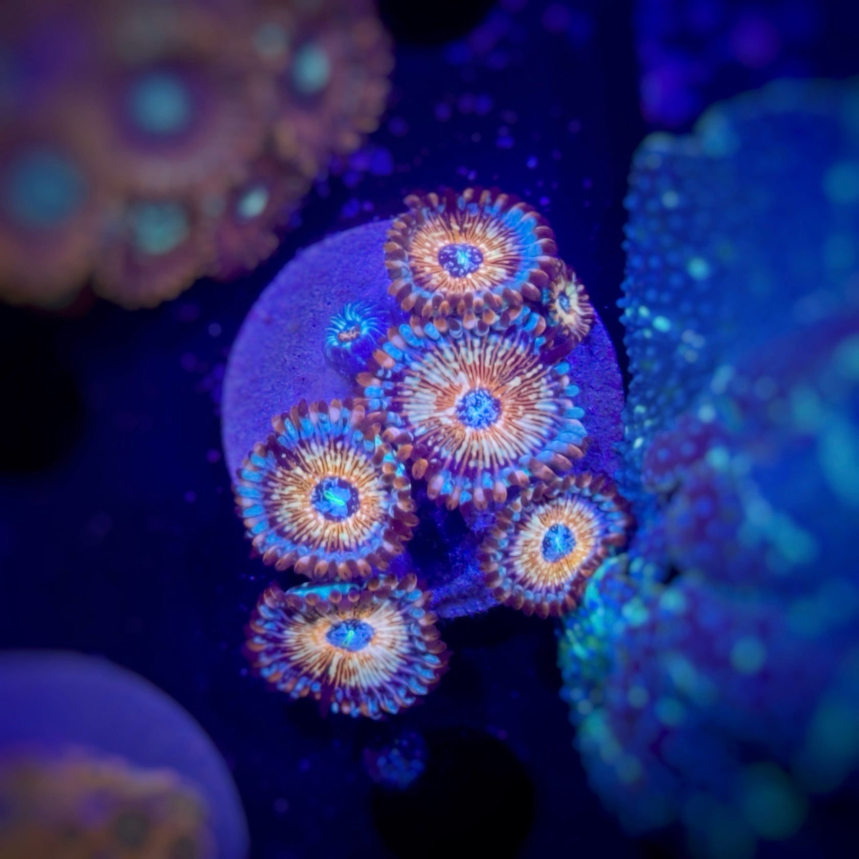 Eine außergewöhliche Krustenanemone mit großen Polypen in roter Grundfarbe. Jeder neue Polyp entwickelt ein individuelles Muster in Eisblau.